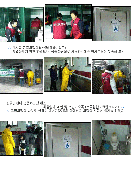 탑골공원 ‥ 신발을 닦고 들어갈 깔개 등의 물품이 없어 바닥청소에 필요 이상의 노동력 필요하고 많은 변기가 비치되어 있기는 하였으나 몇 개의 고장변기가 보수없이 방치 되어있음.