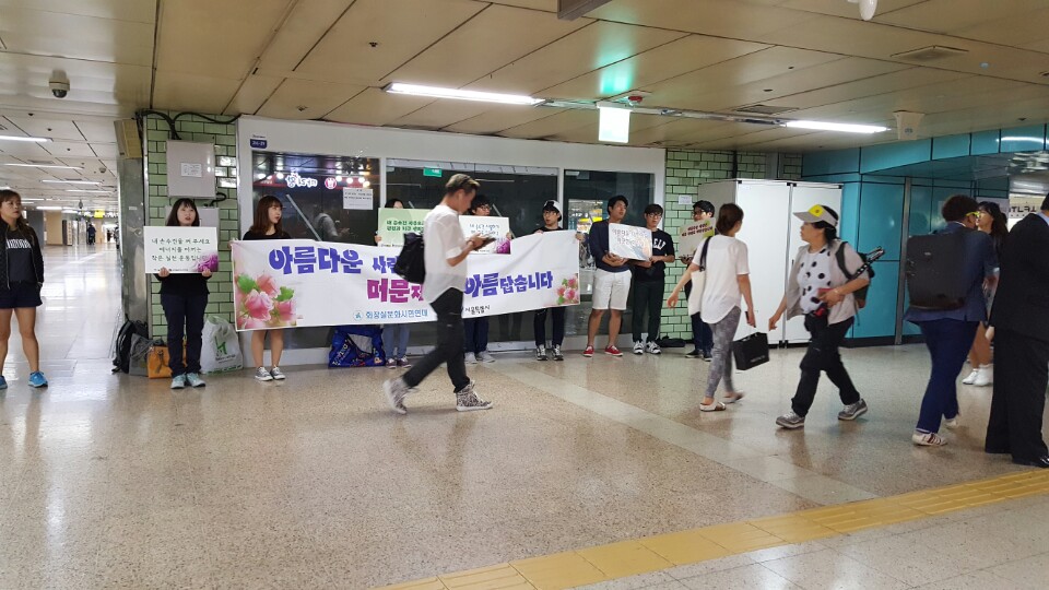 | 1. 실시일 : 2015년 9월 18일 2. 실시 장소 : 잠실역 3. 주제 : 올바른 화장실 이용문화 캠페인 4. 참가인원 : 10 |