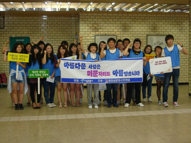 | (9월) 1차 캠페인 보고서 1. 실시일 : 2010년 9월 10일 2. 실시 장소 : 성수역 3. 주제 : 2010 G20서울정상회의 알리기 및 화장실이용문화 캠페인 4. 참가인원 : 30명 |