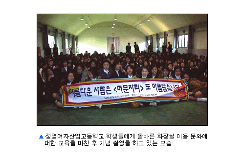 ‥ 정명여자 산업고등학교의 강당에서 본교 2학년학생들을 대상으로 교육을 했다. 특히, 넓은 강당과 좋은 비디오 시설로 교육하는데 많은 도움이 되었다. 노래 "화장실은 깨끗이"를 들으면서 교육을 시작했다. 이후 비디오 "깨끗한 화장실은 우리의 얼굴"을 시청했고, "화장실은 소중한 자산" 이라는 주제로 국장님의 강연이 있었다. 고등학생들이었지만 비디오에 대한 교육효과는 초등학생 및 중학생과 마찬가지로 높아 보였다.