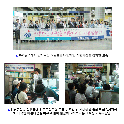 ‥ 화장실문화 시민연대 사무실에서 영남중학교 8명의 학생들에게 '아름다운 사람'이란 주제를 가지고 표혜령 사무국장님이 연설하였습니다. 외적인 '아름다운 사람'과 내적인 '아름다운 사람'의 차이를 설명하고, 요즘 내적인 '아름다운 사람'은 많이 찾아 볼 수 없다는 점을 화장실 이용문화에 비추어 역설하였습니다. 내적인 아름다움을 키우기 위해선 남을 사랑하고 배려하는 마음이 밑바탕이 되어야함을 강조하고, 사회를 이루는 구성원 중에 하나가 바로 나(아름다운 사람) 자신임을 잊지 말고 내가 살아가는 사회를 아름답게 만들자고 결론 맺으셨습니다
